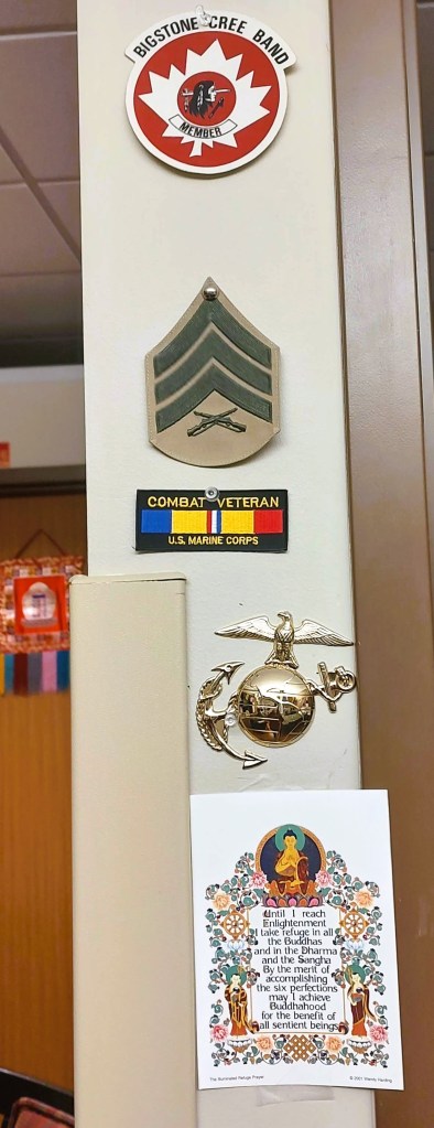 Today, as he speaks to visitors from his high-tech wheelchair, he faces a vertical display of his Vietnam War combat veteran ribbon, his sergeant’s stripes, his badge of membership in the Bigstone Cree Band, a shiny Marine Corps globe symbol with anchor and eagle, and a Buddhist prayer. “Until I reach Enlightenment I take refuge in all the Buddhas and in the Dharma and the Sangha….”