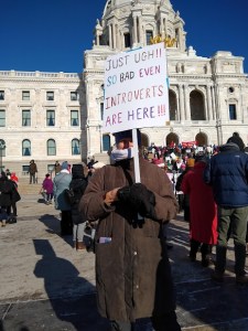 Yes! Introverts, women, teenagers, former colleagues, trans folks, children, old lefties like me, fresh feminists, church buddies, men and more. People who just had to roll out of bed on a frigid sunny Saturday to join 4,000 friends and allies in front of the Minnesota Capitol to cheer for women’s rights and human rights and justice and love. And to sing.